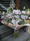 V této celoroční kytici s dlouhými stonky jsme dali dohromady elegantní a velmi oblíbenou eutomu v bílé a fialové barvě.