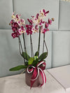 4 stonky orchideje Phalaenopsis umístěné ve stylovém keramickém květináči.