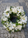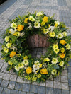 This wreath arrangement can be prepared in various colours of your choice, and garden style as pictured is our favourite. This means we will use several types of small garden flowers (no lillies, callas or big roses). If you however prefer the classics, we will gladly fulfill your wish.
